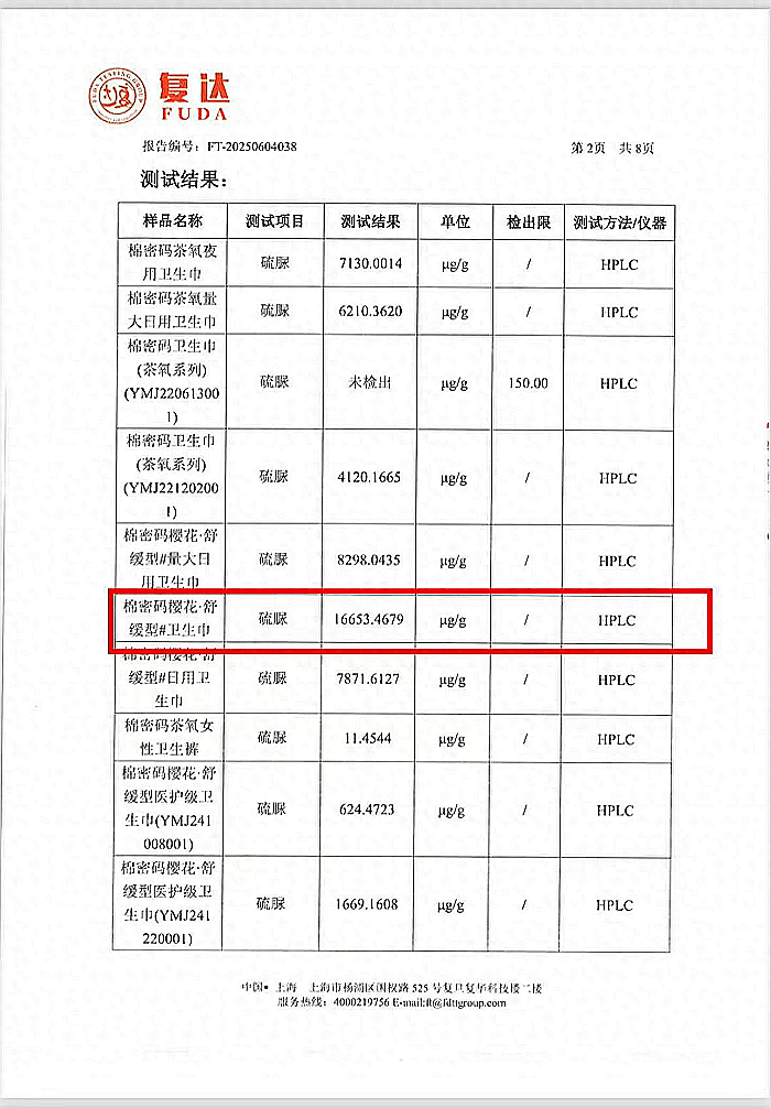 然而风波并未平息。据媒体报道,今年5月,王先生曝光“棉密码”卫生巾添加硫脲并组织送检,辛巴自创品牌“棉密码”卫生巾被检出超高含量致癌物。消费者集体送检的检测报告显示:从2019年9月到2025年1月,多个批次的“棉密码”茶氧夜用卫生巾、茶氧日用卫生巾等品类均检出超高含量硫脲(硫脲,是一种在工业、农业、医药领域广泛应用的含硫有机化合物,被列入《危险化学品名录(2015)版》中,因其长期暴露可能导致较高的生物健康风险,被国际癌症研究联盟列为3类致癌物)。其中,“棉密码”卫生巾芯片正是检出硫脲的重灾区。