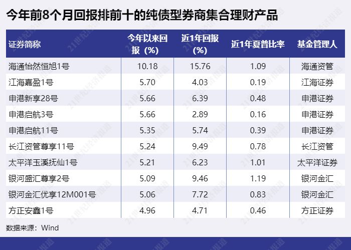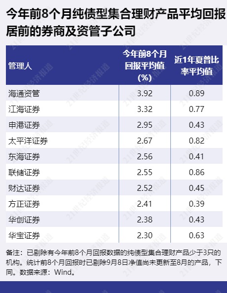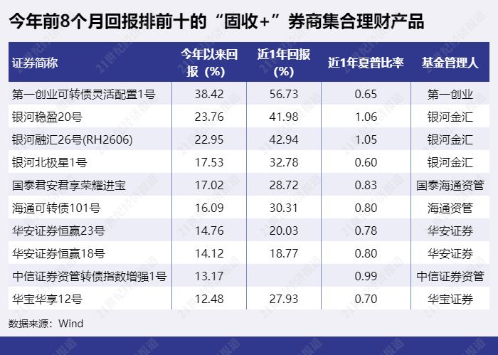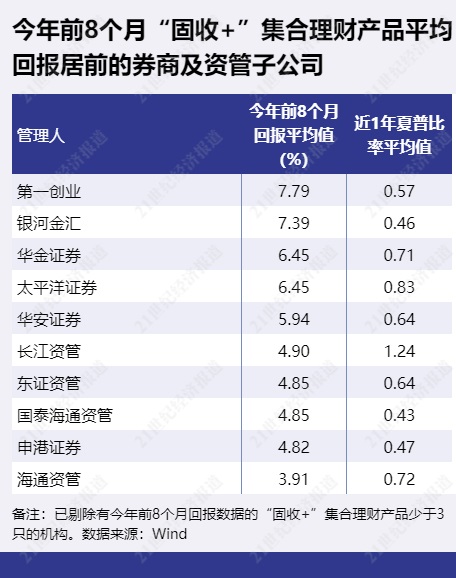 今年前8个月“固收+”集合理财产品平均回报居前的券商及资管子公司为第一创业、银河金汇、华金证券等。
