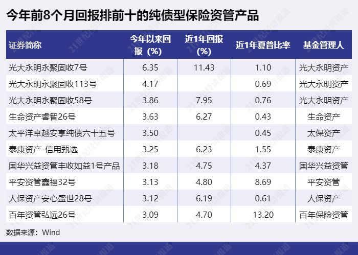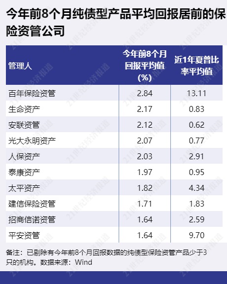 而前8个月纯债型产品平均回报排名靠后的保险资管公司则包括中意资产、民生通惠、工银安盛资管等。