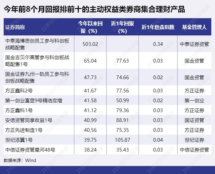 主动权益类产品整体表现不错,有3家券商及资管子公司的主动权益类集合理财产品前8个月平均回报已超20%,分别为方正证券29.49%、中泰证券资管28.47%、野村东方国际证券25.96%。